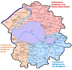 Con la supresión del departamento del Sena, las 81 comunas fueron repartidas entre cuatro departamentos: París (una comuna), Altos del Sena (27 comunas), Sena-San Denís (24 comunas) y Val-et-Marne (29 comunas).