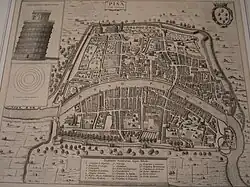 Pisa, que por aquella época estaba enfrente del mar, en la desembocadura del Arno, alcanzó su máximo esplendor entre los siglos XII y XIII, cuando sus barcos controlaban el Mediterráneo occidental. La rivalidad entre Pisa y Génova se agudizó en el siglo XIII y estalló en la batalla de Meloria (1284), que marcó el declive del poderío pisano, con la renuncia de Pisa a toda pretensión sobre Córcega y la cesión a Génova de parte de Cerdeña (1299).