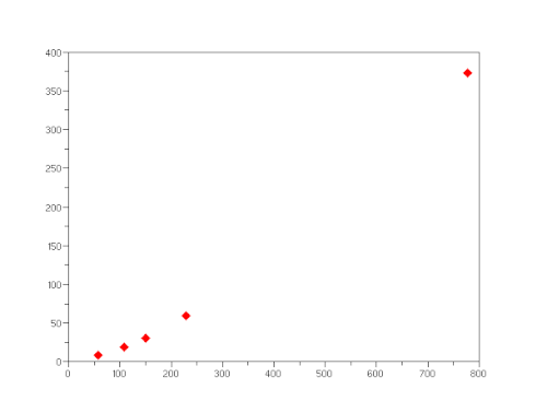 | Representación logarítmica del periodo de revolución frente al semieje mayor de los planetas del sistema solar. Para un ajuste de la línea recta, ver serie estadística de dos variables. | La misma serie de datos en representación cartesiana, habría conducido a un amontonamiento de los primeros puntos para permitir colocar el último punto, y habría colocado dichos puntos en una curva parecida a una función polinomial. |