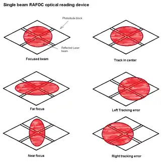 Las diferentes marcas y modelos de conjuntos ópticos utilizan diferentes métodos de detección de enfoque. En la mayoría de los reproductores se realiza utilizando la diferencia en la salida de corriente de un bloque de cuatro fotodiodos. El bloque de fotodiodos y la óptica están dispuestos de tal manera que un enfoque perfecto proyecta un patrón circular en el bloque, mientras que un enfoque demasiado lejano o cercano proyecta una elipse que difiere en la posición del borde largo en norte-sur o oeste-suroeste. Esa diferencia es la información que usa el servoamplificador para mantener la lente a la distancia de lectura adecuada durante la operación de reproducción, incluso si el disco está deformado.[41]
