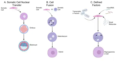 Un ovocito puede reprogramar un núcleo adulto hacia un estado embrionario tras realizar una transferencia nuclear de células somáticas, de tal forma que un organismo nuevo pueda desarrollarse a partir de tal célula[14] (véase también "clonación").