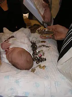 Baruj atá Ado--nai, Elo--henu Mélej haolám, asher kidshanu bemitzvotav, vetzivanu al pidión HaBen. ("Bendito eres tú, señor nuestro Dios, rey del Universo, quien nos santificó con sus preceptos y nos instruyó acerca de la redención del hijo."). Baruj atá Ado--nai, Elo--henu Mélej haolám, shejeianu vekimanu veiguianu lazmán hazé ("Bendito eres tú, señor nuestro Dios, rey del Universo, quien nos ha mantenido con vida, nos ha sostenido y nos trajo a este momento.").