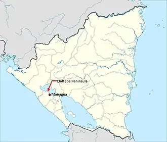 La península de Chiltepe con su forma redondeada se levanta en la costa sur del lago Xolotlán, a unos 15 kilómetros al noroeste de la ciudad capital.