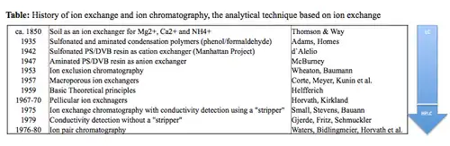 Los métodos iónicos se han utilizado desde 1850, cuando H. Thompson y J. T. Way, investigadores de Inglaterra, trataron diversas arcillas con sulfato de amonio o carbonato en solución para extraer el amoníaco y liberar calcio. En 1927 se utilizó la primera columna de zeolita mineral para eliminar iones de calcio y magnesio que interferían en la solución, para determinar el contenido de sulfato de agua. La versión moderna de la IEC se desarrolló durante la época de la guerra del Proyecto Manhattan. Se requería una técnica para separar y concentrar los elementos radiactivos necesarios para hacer la bomba atómica. Los investigadores eligieron absorbentes que pudieran cerrarse sobre elementos transuránidos cargados, y que pudieran eliminarse diferencialmente. Finalmente, una vez desclasificada en 1947, la Comisión de Energía Atómica dio a conocer la información sobre el uso de la cromatografía de intercambio iónico para la separación de productos de fisión nuclear. Estas técnicas pueden utilizar nuevas resinas IE para desarrollar los sistemas que se utilizan a menudo hoy en día para la purificación específica de productos biológicos y de sustancias inorgánicas.