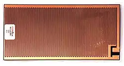 - Lámina grabada: los elementos de láminas grabados generalmente se fabrican con las mismas aleaciones que los elementos de hilo calefactor, pero se producen con un proceso de fotograbado sustractivo que comienza con una lámina continua de lámina metálica y termina con un patrón de resistencia complejo . Estos elementos se encuentran habitualmente en aplicaciones de calefacción de precisión tales como diagnóstico médico y aeroespacial.
