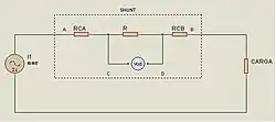 En la imagen se puede apreciar una fuente de corriente senoidal con una resistencia de carga terminal. En el medio se intercala el Shunt que, al ser atravesado por una elevada corriente entre sus terminales A y B, entrega una tensión proporcional entre sus terminales C y D.