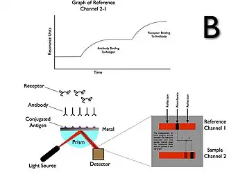 El primer inmunoensayo SPR fue propuesto en 1983 por Liedberg, Nylander y Lundström, entonces del Instituto Tecnológico de Linköping (Suecia). [15] Adsorbieron IgG humana en una película de plata de 600 Ångström y utilizaron el ensayo para detectar IgG antihumana en una solución acuosa. A diferencia de muchos otros inmunoensayos, como ELISA, un inmunoensayo SPR no tiene etiquetas porque no se requiere una molécula marcadora para la detección del analito. [16] [17] [14] Además, las mediciones de SPR se pueden seguir en tiempo real, lo que permite monitorear pasos individuales en eventos de unión secuenciales, particularmente útiles en la evaluación de, por ejemplo, complejos tipo sándwich.