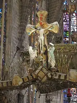 Una de las intervenciones más vistosas fue la colocación de un baldaquino sobre el altar mayor, que cuelga desde la bóveda y cubre el altar como si fuese una corona. Tras una primera versión de forma cuadrada, que fue inaugurada el 8 de diciembre de 1904 —coincidiendo con el fin de la primera fase de las obras—, con posterioridad se colocó una segunda versión, que fue inaugurada el 29 de junio de 1912.[49] En realidad se trata de una maqueta a tamaño natural, realizada en cartón, madera, alambre y papel, que debía sustituirse por la versión definitiva, aunque solo se realizó uno de sus lados, con medallones de hierro con vidrios policromados. Desde entonces perdura la obra efímera que servía de guía, aunque por su diseño y riqueza ornamental cumple sus funciones como si fuese la obra definitiva. Este baldaquino tiene forma heptagonal, de cuya corona cuelgan treinta y cinco lámparas de latón —el proyecto original preveía cincuenta, por el Pentecostés, el quincuagésimo día después de la Resurrección—, sobre la cual se sitúa un tapiz brocado que presenta unos diseños de tema eucarístico; en su vértice se emplaza un conjunto escultórico con la cruz y Jesucristo crucificado, con la Virgen María y san Juan a sus pies, elaborado de pasta de papel y con una iluminación eléctrica interior, que hace que el conjunto brille. Por otro lado, de los siete lados de la corona surgen en su parte superior espigas de trigo, mientras que en la inferior cuelgan hojas de parra, símbolos ambos de la eucaristía, por el pan y el vino.[50] Hasta los años 1970, el tapiz de la cobertura incluía un pelícano, símbolo de la eucaristía. El baldaquino fue restaurado en 1999.[51]