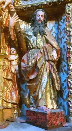 Esta talla es la de mayor tamaño junto con San Juan Bautista. El apóstol aparece apoyándose firmemente en una cruz aspada con el brazo derecho y sujetando un libro con la mano izquierda. La obra fue tallada por algún maestro del siglo xvii y muestra una vistosa barba resuelta en mechones simétricos. Cabe destacar que en la seo hubo una capilla dedicada a San Andrés en lo que a día de hoy es la sacristía; cuando esta se construyó la capilla fue desplazada unos pocos metros al oeste, sitio en el que actualmente se ubica el retablo de la Virgen del Carmen, lugar en el que existió un retablo en honor a Santa Catalina donde se veneraba una imagen del santo,[nota 7] talla que se cree se corresponde con la que hoy día alberga el retablo de San Juan y que por lo tanto constaría en unos apuntes redactados por Manuel Sánchez Arteaga a finales del siglo xix, época en la que dicha imagen figuraba ya en el retablo de San Juan.[1]: 104 [nota 8]