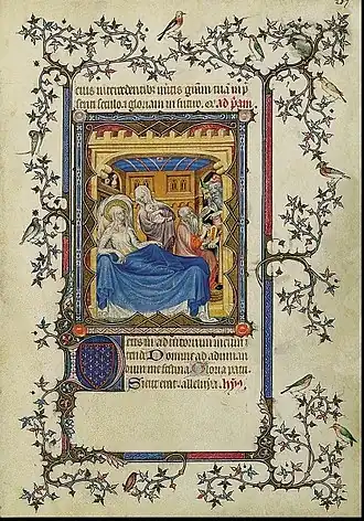 Zacarías aparece en la tabla sentado en primer plano con pluma, tintero y pergamino. A su derecha, María le presenta el bebé. Al incluir a la Virgen, Rogier se aleja del relato evangélico, refiriéndose en cambio a la versión apócrifa popularizada por la Leyenda Dorada y las Meditaciones de la vida de Cristo, que ponen a María presentando al niño Juan. Erwin Panofsky sugiere que Rogier podría haber sido influido por el relieve de Andrea Pisano Nombramiento del Bautista en el Baptisterio de Florencia, la cual muestra una escena similar de María presentando el recién nacido a Zacarías, sentado con pluma y pergamino.