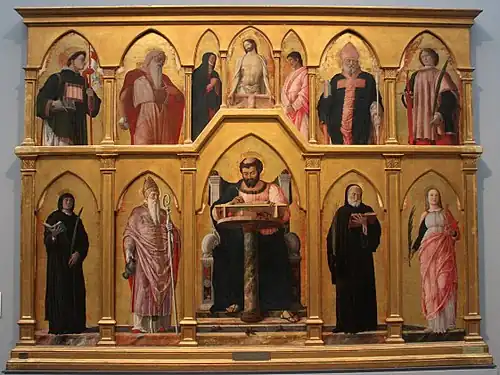 Arriba, San Daniel de Padua y San Jerónimo penitente, a la izquierda, y San Agustín y San Sebastián, con palma y espada, a la derecha, flanquean la figura central de Jesucristo alzado sobre el sepulcro de mármol veteado, mostrando las heridas en las manos, el lanzazo en el costado, es góticamente alargado pero ya muestra el estilo mantegna en una inusual anatomía marcada, clasicista; a los lados, cada uno en su panel, María y Juan que le observan con tristeza.