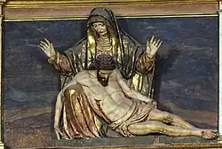 Adjudicada erróneamente a Fernández por Antonio Ponz, en el ático del retablo se ubica una talla de bulto redondo de la Piedad, dotada de unas características a nivel formal que en su momento resultaron trascendentales para la imaginería vallisoletana del barroco. María aparece arrodillada sobre una sección elevada del terreno, sirviendo la pierna derecha flexionada como punto de apoyo para el cuerpo de Jesús y permitiendo a su vez que la Virgen pueda alzar los brazos en señal de desesperación y súplica. Esto constituye una clara evolución en el escultor, quien con esta imagen trasciende del típico replegado del Renacimiento (que estudió en su etapa formativa) hacia la expresión barroca, definida por una gran elocuencia cargada de gesticulaciones y movimientos abiertos. María luce un atuendo compuesto por una túnica de color rojo, varias tocas en tono marfil y un manto azulado con envés en oro, todo ello cubierto de profusos drapeados. El gesto de la Virgen es de gran dolor y desconsuelo, con la cabeza inclinada en dirección a su hijo y motivado esto por su posición elevada. Cristo, quien acaba de ser bajado de la cruz, reposa inerte en la pierna derecha de María (por encima de la cual se halla su brazo derecho) y exhibe una curvatura del cuerpo, claramente miguelangelesco, de gran naturalismo gracias a la detallada anatomía, hallándose las piernas posadas sobre el suelo y posicionadas a imagen y semejanza de los Cristos crucificados, con los cuales comparte además la caída de la cabeza sobre el pecho así como la herida de la lanza de Longinos. Definida por Ponz como una «figura entera del natural, sentada, de excelente expresión», Isidoro Bosarte la atribuyó también a Fernández, adjudicando el resto de la imaginería equivocadamente a Pompeo Leoni: «La que está en la parte superior del retablo principal de la iglesia de las Angustias. Está tan alta que no podemos hacer un juicio de sus perfecciones. Tiene muy echado el manto sobre la cara. Su composición es como la general de este asunto: Nuestra Señora sentada sosteniendo sobre las rodillas el cuerpo del Señor difunto. Todo lo demás de este retablo mayor de las Angustias se atribuye a Pompeyo Leoni y ciertamente no es de Hernández».[1][2]