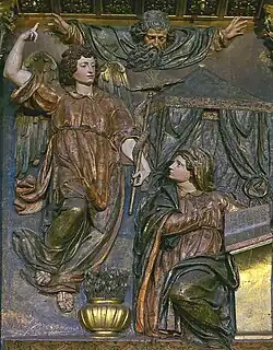 Atribuido a del Rincón al igual que el resto de las esculturas por Martín González, el relieve, poco frecuente en una obra de estas características debido a que lo usual en los retablos mayores era disponer pinturas o tallas de bulto redondo, constituye el tema central de la obra y se erige como una pieza de carácter monumental dotada de una composición teatral y luminosa en la que la narrativa queda reducida a lo más esencial. En la zona superior se halla una imagen de Dios Padre con los brazos extendidos y en pronunciado escorzo admirando cómo el arcángel San Gabriel transmite su mensaje a la Virgen, mostrando la talla una prominente barba influenciada por los modelos miguelangelescos presentes en la Capilla Sixtina. Debajo del Altísimo aparece el Espíritu Santo bajo forma de paloma, con el arcángel señalando la parte alta del relieve, conformada aquí como una suerte de escena sobrenatural en la que se plasma la buena nueva. Acorde a la tradición iconográfica, María es mostrada de rodillas e interrumpiendo la lectura de un libro apoyado en un atril, elemento que junto con un búcaro a la izquierda repleto de lirios (flor que representa simbólicamente su virginidad) y una cama con dosel detrás de la Virgen compone el mobiliario de la escena. La madre de Jesús tiene el cuerpo girado a su derecha para poder ver al arcángel; la pierna izquierda se halla flexionada y casi de perfil como lo está la cabeza mientras que el cuerpo se exhibe de frente al espectador, lo que origina un movimiento helicoidal y serpenteante que dota de movimiento a la figura, la cual muestra una corpulencia propia del romanismo aunque las facciones se encuadran en el clasicismo, si bien posee cierto grado de frialdad y hieratismo en los gestos, pudiendo apreciarse una anatomía muy marcada bajo los arrugados paños (consistentes en toca, túnica y manto).[1][2]