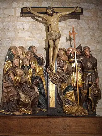 La composición la centra la talla del crucificado, ya muerto y con la herida del costado abierta. Cristo divide a las figuras secundarias en dos grupos. A su derecha quedan "los buenos": el evangelista Juan, Nicodemo, José de Arimatea y un grupo de santas mujeres que asisten a la Virgen, desmayada ante la pérdida de su hijo. En el grupo de la izquierda, "los malos", dos sayones y dos romanos que se burlan de los dolientes. El soldado que porta la pica puede identificarse como Longinos. La excepción a la distribución de los grupos la pone María Magdalena, arrodillada en el lado izquierdo y con la cabeza elevada en contemplación de Cristo.