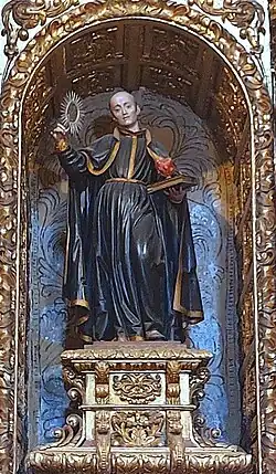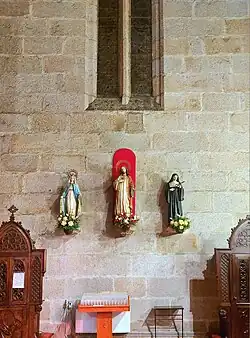 Las imágenes de San Ignacio y San Francisco Javier, relacionadas con las tallas homónimas de la Iglesia de la Compañía de Jesús de Santiago de Compostela (ambas de influencia vallisoletana) y de la Iglesia de San Miguel de Valladolid, poseen una altura aproximada de 1,60 metros, lucen sotana y exhiben respectivamente un corazón flamígero y una cruz, si bien la pose de la mano izquierda de San Ignacio induce a creer que portaba el libro de las Constituciones o de los Ejercicios Espirituales y, tal vez a mayores, una custodia, aunque también podría haber sostenido una maqueta de una iglesia, lo que la acercaría aún más a la talla de Valladolid. Es preciso destacar que en 1886, aparte de la adquisición de las «diademas» de ambas imágenes, se indica en un libro de fábrica un pago de 70 reales por «hacer la mitad del brazo y la mano de la imagen de San Ignacio de Loyola», figurando en el mismo libro en 1890 un pago «Al pintor d. Jacobo Vales por la restauración en pintura y escultura de las efigies de S. Ignacio de Loyola y S. Francisco Javier».[1]: 119–120 Hay constancia documental de que San Francisco Javier portaba una cruz de plata en la mano derecha que en algún momento fue sustituida por la actual, una azucena también de plata en la mano izquierda, y una cadena al cuello con un corazón decorado con el anagrama IHS igualmente de plata, mientras que San Ignacio lucía en la mano derecha el mismo anagrama envuelto en rayos y elaborado también en plata, reemplazado por el actual corazón, pieza que sostiene de forma poco natural.[7]: 433 Por su parte, las tallas de San Luis y San Francisco de Asís miden alrededor de 1,30 metros de alto y lucen hábito franciscano y coronilla afeitada (tonsura), mostrando San Luis una capa pluvial y una mitra mientras se apoya en un báculo. Respecto a la imagen de Santa Eufemia, esta apenas tiene 0,87 metros de alto; viste túnica y manto y luce un puñal clavado en el costado y una palma en la mano izquierda como símbolos de su martirio,[1]: 120 quedando constancia de que en 1886 se gastaron 120 reales «Por hacer un brazo y restauración de la pintura en la imagen de la patrona de la parroquia».[1]: 121