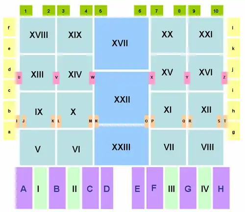 En los intercolumnios del tercer piso, tres por cada columna, se sitúan figuras de Profetas, de izquierda a derecha: (U): Zacarías, Elías y Sofonías, (V): Naum, Jonás y Amós, (W): Ezequiel, Isaías y Oseas, (X): Joel, Jeremías y Daniel, (Y): Abdías, Miqueas y Eliseo, (Z): Habacuc, Ageo y Malaquías.