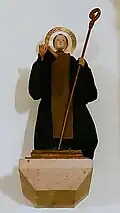 Imagen de vestir, el santo es representado imberbe y ataviado con túnica marrón bajo la que se aprecia tela de color negro, portando por encima una capa también negra de amplias mangas que podría constituir una reminiscencia del hábito benedictino. En la mano derecha exhibe un libro mientras que con la izquierda aferra un báculo, muy probablemente representaciones del libro de la orden y el bastón abacial, ambos elementos identificativos del santo.[11]: 59 Pese a que en el inventario de 1983 consta la existencia de una imagen barroca de San Benito,[5]: 193 se cree que esta data del siglo xix.[2]: 449 | ![]() |
