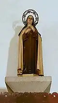 Luce hábito carmelita y porta los dos elementos propios de su iconografía: un crucifijo y varias rosas. Encuadrada en el denominado «arte de San Sulpicio» y en un estado de conservación regular a causa de varias pérdidas cromáticas, no figura en el inventario de 1983,[5]: 193 aunque se cree que debía de hallarse en el templo para 1898 puesto que en el libro de fábrica de ese año consta la siguiente anotación: «A los que llevaron la imagen de Santa Teresa en la procesión».[2]: 446 | ![]() |
