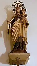 La Virgen figura de pie sosteniendo a su hijo con el brazo izquierdo y portando dos escapularios con el derecho. De acuerdo con el inventario de 1983,[5]: 193 la imagen fue creada en el siglo xx, pero por sus características y por la presencia de esta advocación entre las imágenes del templo en la década de 1950, se puede situar su factura entre 1940 y 1960.[4]: 90 | ![]() |