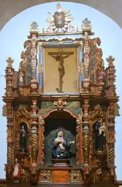 El retablo, de planta poligonal y notablemente inclinado a la derecha,[nota 6] se compone de un basamento conformado por un zócalo de madera adherido al paramento de la nave y un altar de traza sinuosa sobre el que se halla una predela, la cual soporta un cuerpo y un ático distribuidos en tres calles. Flanqueando la sección central, de prominente planta y altura, se disponen dos pares de estípites superpuestos, hallándose igual número de soportes balaustrados delimitando el retablo en los laterales. En lo referente a la decoración, destacan espejos, rocalla, formas en S y relieves con forma de riñón, siendo la policromía a base de marmoleados imitando piedra noble a los que se superponen el dorado de los motivos ornamentales y las molduras.[2]: 440 Tanto el empleo de estípites, de gran profusión en la retablística gallega de mediados del siglo xviii, como la policromía a partir de vetas, la decoración rococó y la estabilidad horizontal del cornisamento,[6]: 218 hace suponer que la obra data del último tercio del siglo xviii.[2]: 440