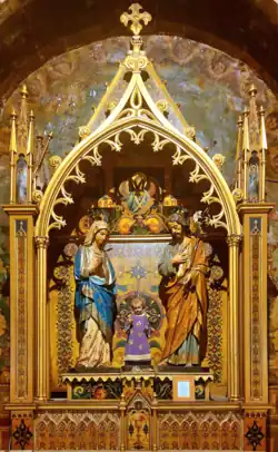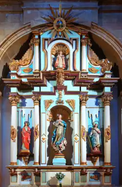 Respecto al ático, este alberga un nicho idéntico al del cuerpo aunque de menor tamaño coronado por un medallón circundado por rayos y presidido por una imagen del Espíritu Santo bajo forma de paloma.[2]: 437 El nicho lo preside una talla de madera del Niño Jesús de Praga de 0,70 metros; esta imagen es una talla lígnea de vestir que de acuerdo con el inventario de 1983 fue elaborada en el siglo xx,[5]: 193 probablemente en las dos primeras décadas de la centuria puesto que en un libro de fábrica consta el pago de su peana en 1917. Por otro lado, dicho inventario sitúa la factura de la Inmaculada Concepción también en el siglo xx; en base al estilo de la imagen y por la presencia de esta advocación en la imaginería de la iglesia en la década de 1950,[4]: 90–91 podría afirmarse que la pieza data de la primera mitad del siglo, circunstancia extrapolable a las imágenes de Santa Lucía y Santa Cecilia por poseer un estilo similar,[2]: 438 procediendo al menos la figura de Santa Cecilia de los talleres de Olot.[10]