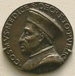 La obra se pintó para Goro Gheri en homenaje al antepasado de la fortuna de la familia Médici, muerto más de cincuenta años antes, en 1464. Gheri era responsable desde septiembre de 1519 de la administración extraordinaria de Florencia y su carrera había comenzado como secretario de Lorenzo duque de Urbino, fallecido en mayo y último representante de la rama principal, denominada "de Cafaggiolo", de la familia; la obra debió nacer así pues en un momento bastante crítico para la dinastía medicea y es posible que hubiera sido el mismo papa León X, nacido Juan de Médici, quien la solicitó. En junio de hecho nació un nuevo heredero varón, hijo de Juan de las Bandas Negras (exponente de la rama "popolano") y de María Salviati (hija de la hermana del papa, Lucrecia), que en honor al ilustre antepasado fue llamado Cosme.