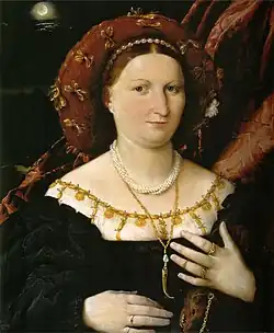 La protagonista aparece a media figura, con el busto frontal y el rostro ligeramente de tres cuartos. La vestimenta denota su alto estatus social, con un vestido oscuro de mangas amplias y abullonadas, muy escotado pero moderado al asomar una fina camisa con cintas doradas y bordados en forma de concha, así como abundantes joyas: varios anillos, un collar de perlas de varias vueltas retorcidas y una cadena con un colgante en forma de cuerno de oro, que era usado como palillo en la época. En la cabeza lleva un voluminoso tocado bermellón con lazos dorados y perlas, la "capigliara" o "balzo", según una moda lanzada por Isabel de Este.