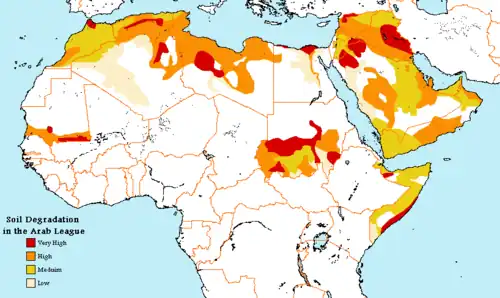 - Menor rendimiento de los cultivos: recientes incrementos en la población mundial han puesto una gran presión en los sistemas de suelos del mundo. Más de 6 mil millones de personas usan hoy en día cerca del 38 % del área terrestre para cultivos y ganado.[4] Muchos suelos sufren de varios tipos de degradación, que pueden en última instancia reducir su habilidad para producir recursos alimenticios. Se distingue entre degradaciones leves, donde el potencial de rendimiento ha disminuido en un 10 %; degradaciones moderadas, con disminuciones entre el 10 y 50%; y degradaciones severas, en suelos que han perdido más del 50% de su potencial. La mayoría de estos últimos se encuentran en países en desarrollo, en Asia y África.