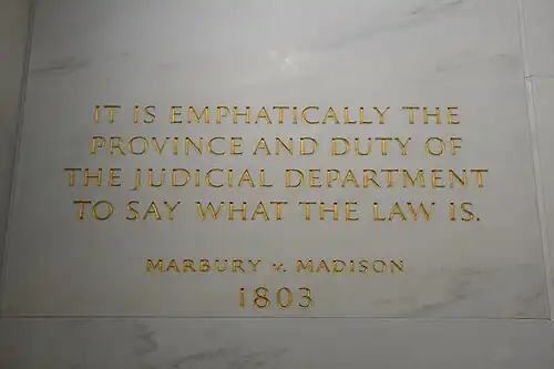 En segundo lugar, la idea de separación de poderes es otra teoría sobre una forma de gobierno democrática. En contraste con la supremacía legislativa, la idea de la separación de poderes fue presentada por primera vez por Montesquieu;[1] más tarde fue institucionalizado por primera vez en los Estados Unidos por el fallo de la Corte Suprema en el caso Marbury contra Madison bajo la corte de John Marshall. La separación de poderes se basa en la idea de que ningún poder debería predominar sobre los demás sin el debido proceso legal; cada poder debe controlar los otros poderes, creando así un equilibrio entre ellos. La clave está en los controles y el equilibrio. En los Estados Unidos, la revisión judicial se considera un control clave de los poderes de las otras dos ramas del Estado por parte de la judicatura.