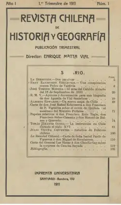 La Revista Chilena de Historia y Geografía apareció en Santiago en 1911 como una publicación trimestral, pertenecía a la Sociedad Chilena de Historia y Geografía. Esta revista fue fundada y dirigida por Enrique Matta Vial, connotado intelectual y miembro de la Academia Chilena de la Lengua y quien tuvo además la misión de reorganizar esta sociedad el mismo año que apareció esta revista. Su foco inicial estaba dirigido a difundir artículos de interés científicos de distintas disciplinas como la historia, geografía, etnografía, etnología, folclore, lingüística, numismática, geología, sismología, meteorología, entre otras.[1]