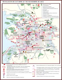 El Comité Militar Revolucionario de Petrogrado comenzó a planear la disolución del Preparlamento, el arresto del Gobierno provisional y la toma de los últimos puntos estratégicos de la ciudad que habían escapado hasta entonces de su control.[112] A las 1:30 a. m., marinos, soldados del Regimiento Kexholm y Guardias rojos tomaron la oficina central[113] de correos.[114] A las dos de la madrugada, tropas del Comité ocupaban la Estación Nikoláievski[115] y la central eléctrica de la ciudad.[113][114] El puente Nikoláievski fue capturado poco después, a las 3:30 a. m., tras anclar cerca el Aurora.[113][114][115] El intento de un pequeño grupo de tropas de choque fieles al Gobierno de retomarlo poco después no tuvo éxito.[113] Soldados del Regimiento Kexholm recibieron órdenes de ocupar la central telefónica, el Banco Estatal y el Tesoro.[116][115] A las 6 a. m.,[114][113] se ocupaba el Banco Estatal y, a las 7 a. m., caía la central telefónica,[113] tras un momento de tensión con los cadetes que la guardaban, pero sin realizar un solo disparo.[116] Se volvieron a conectar los teléfonos de Smolny y se desconectaron los del Palacio de Invierno.[114] Más tarde se capturó sin problemas el Tesoro, que estaba guardado por tropas del Regimiento Pávloski, uno de los más leales al CMR.[114] A las 8 a. m., el CMR capturaba la última gran estación de ferrocarril, la de Varsovia, que comunicaba con el frente norte.[117] Al amanecer, casi toda la ciudad salvo el Palacio de Invierno se hallaba bajo el control del Sóviet de Petrogrado.[112] Ni los defensores del Palacio ni los sitiadores deseaban, sin embargo, enfrentarse y arriesgarse a sufrir bajas.[112] La ciudad despertó con notable normalidad: los edificios oficiales, escuelas y transporte público funcionaban regularmente.[118] El Gobierno carecía para entonces, sin embargo, de luz y teléfono en los edificios que todavía controlaba.[117]