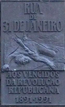 En Oporto, el 31 de enero de 1891, se produjo un levantamiento militar contra la monarquía compuesto principalmente por sargentos y militares sin plaza.[27] Los rebeldes, que tenían como himno una canción de cariz patriótico compuesta como protesta por el ultimátum británico llamada A Portuguesa,[28] tomaron el ayuntamiento, desde cuyo balcón el periodista y político republicano Augusto Manuel Alves da Veiga proclamó la implantación de la república en Portugal y alzó una bandera roja y verde, que pertenecía al Centro Democrático Federal.[29] El movimiento fue sofocado poco después por la guardia municipal que se mantuvo fiel al gobierno. El resultado fue de 12 muertos y 40 heridos. Los rebeldes capturados fueron juzgados y 250 de ellos fueron condenados a penas de entre 18 meses y 15 años de destierro en África.[30] A Portuguesa fue prohibida.