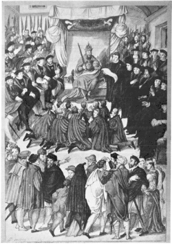 En 1515, Carlos impuso a Gante el edicto Calfvel,[3] que, entre otras cosas, prohibió a los gremios seleccionar sus propios decanos.