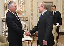 - ↑ a b Olson, Bradley (6 de diciembre de 2016). «Rex Tillerson, a Candidate for Secretary of State, Has Ties to Vladimir Putin». Wall Street Journal. ISSN 0099-9660. Consultado el 14 de diciembre de 2016.