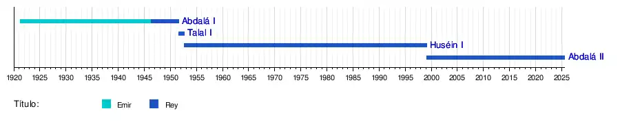 Abdalá I | 11 de abril de 1921 | 25 de mayo de 1946 | Primer gobernante de Jordania. Nació el 2 de febrero de 1882 y murió el 20 de julio de 1951 |