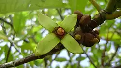 Por lo general, un árbol pequeño o arbusto grande con copa extendida con apoyo de raíces aéreas que descienden de las ramas. Hojas con 1.5 a 2.5 (-3) cm de largo, peciolos de color rojizo teñidas; lámina elíptico-oblongas a ± lanceoladas-ovadas, de 7-15 (-18) cm de largo, 3-6 (-8) cm de ancho, cuneadas en la base, enteras,-apiculada aguda y poco mucronada en las puntas, glabra, oscuro -verde por encima, verde pálido y de color marrón-negro de puntos en la parte inferior; estípulas oblongo-lanceoladas, de 4-8 cm de largo. Pedúnculos más cortos que los pecíolos, en las axilas de las cicatrices de las hojas caídas. Flores sésiles, de dos en dos, de color amarillo; brácteas en forma de copa, crenuladas, carnosas, hipanto corto. Cáliz con lóbulos ovados a ovado-oblongas, de 10-14 mm de largo, de color amarillo-marrón a rojizo, aguda, quilla. Pétalos blancos, lineares a oblongo-lanceoladas, de 8-11 mm de largo, delgados, glabros. Estambres casi sésiles, anteras de 6-8 mm de largo, apiculateacute. Fruto ovoide de 2-2.5 cm de largo, y 1,5 cm de diámetro, rugosa.[2]