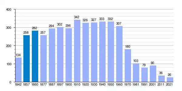 | Gráfica de evolución demográfica de Riaguas de San Bartolomé[8] entre 1842 y 2021 |