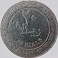 1 rial | 1993- | Acero | Circular | 20,00 | 2,75 | Estriado | Escudo de armas | ريال ١ - البنك المركزي اليمني - año de acuñación | |