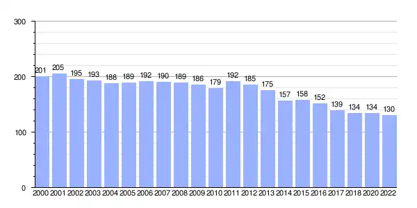 | Gráfica de evolución demográfica de Riberas del Sor[3] entre 2000 y 2022 |