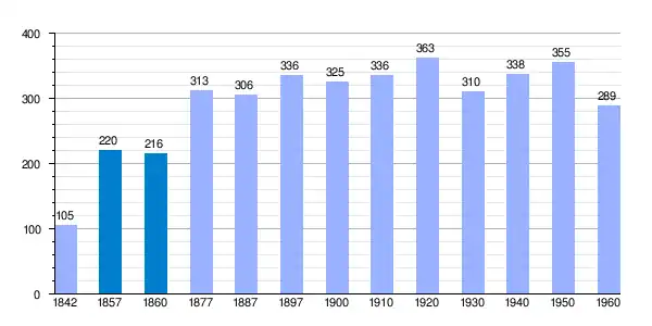 | Gráfica de evolución demográfica de Ricobayo[17] entre 1842 y 1960 |