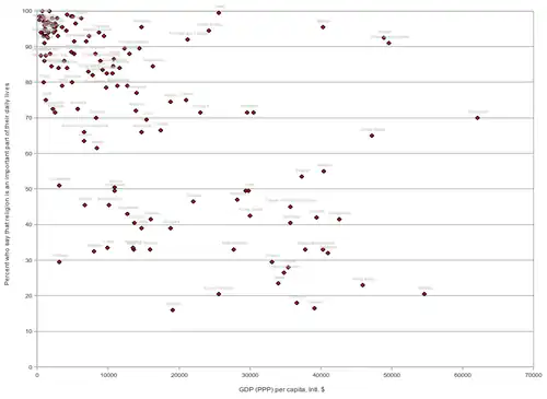 Según algunas teoría el PIB de los países generalmente está correlacionado negativamente con su religiosidad; es decir, a más rica una población, menos religiosa es.[1]