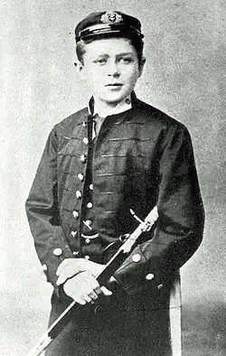 En julio de 1883 Scott terminó su formación y dejó el Britannia como guardiamarina, séptimo de una clase de 26.[8] En octubre ya estaba en camino a Sudáfrica para embarcar en el HMS Boadicea, buque insignia del Escuadrón del Cabo y primero de los varios barcos en los que serviría Scott durante sus años como guardiamarina. Estando en la isla de San Cristóbal, en el Caribe, a bordo del HMS Rover, se encontró por primera vez con Clements Markham, entonces secretario de la Royal Geographical Society (Real Sociedad Geográfica), quien cobraría gran importancia en la carrera posterior de Scott. En aquella ocasión, 1 de marzo de 1887, Markham observó al cúter del guardiamarina Scott ganar la carrera matutina a lo largo de la bahía. Markham tenía la costumbre de «fichar» jóvenes oficiales de la marina como Scott con la intención de iniciar en un futuro las exploraciones polares. Quedó impresionado por la inteligencia, entusiasmo y encanto de Scott, y tomó nota del guardiamarina de 18 años.[9]