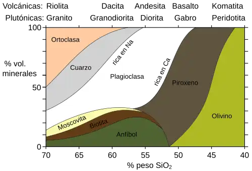 Las rocas ígneas están compuestas fundamentalmente por silicatos (SiO44-); estos dos elementos, más los iones aluminio, calcio, sodio, potasio, magnesio y hierro constituyen aproximadamente el 98 % en peso de los magmas. Cuando estos se enfrían y solidifican, dichos elementos se combinan para formar dos grandes grupos de silicatos:[3]
