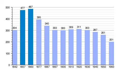 | Gráfica de evolución demográfica de Roda de Isábena[3] entre 1842 y 1960 |