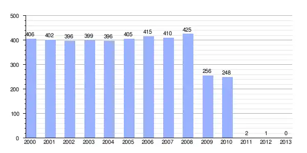| Gráfica de evolución demográfica de Rodiño entre 2000 y 2013 |