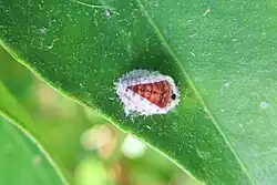 La larva alcanza los 5 mm de longitud, es de color rojo con manchas negras en el tórax. El dorso lo tiene recorrido por varias series de abultamientos portadores de cerdas. La pupa tiene ente 4 y 5 mm, es de coloración roja.