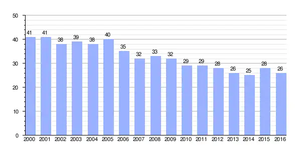 | Gráfica de evolución demográfica de Rodrigatos de la Obispalía[2] entre 2000 y 2016 |