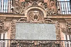 REYNANDO PHELIPE V EL ANIMOSO LA M.N. Y M.L. CIUDAD DE SALAMANCA EMPEZO ESTA OBRA A 10 DE MAYO DEL AÑO 1729, SIENDO CORREGIDOR EL SEÑOR D. RODRIGO CAVALLERO Y LLANES, YNTENDENTE GENERAL DE CASTILLA, POR SUS DIPUTADOS LOS SEÑORES D. JUAN DE BARRIENTOS Y SOLIS, D. FRANCISCO HONORATO Y SAN MIGUEL, D. JOSEPH DEL CASTILLO, CONDE DE FRANCOS, D. JUAN GUTIERREZ Y D. FRANCISCO DE SORIA, Y SE CONCLUYERON LAS DOCE CASAS DE ESTA LINEA LLAMADA PAVELLON REAL EL DIA 3 DE MARZO AÑO DE 1733. SOLI DEO HONOR ET GLORIA