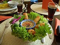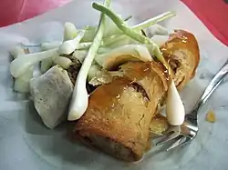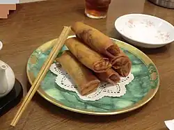 El rollito de primavera, arrollado primavera, empanada china[1] o chun kun (en chino: 春卷, pinyin: chūn juǎn, jyutping: ceon1 gyun2), parecido a la lumpiá, es un rollo elaborado de una pasta con relleno de diferentes verduras picadas al estilo juliana. Introducidos en Occidente gracias a la enorme difusión de la comida china que han realizado los restaurantes chinos en las principales capitales del mundo. Se ha confundido generalmente en Occidente con el rollo de huevo que se elabora de una pasta mucho más fina y que suele ser mucho más grande y por lo tanto posee mucho más ingredientes en su interior. El rollito de primavera tiene una pasta (que hace la función de envoltorio) elaborada con harina de arroz, estilo vietnamita y tailandés, mientras que el rollo de huevo se hace con una masa elaborada de harina de trigo y huevo. En China se utiliza sólo harina de trigo. Hay que destacar que es ésta la que más se conoce, que se hace a mano sobre una plancha caliente desde su inicio. En Chile el rollo primavera consiste en traer un relleno de verduras, repollo, zapallo italiano y zanahoria, rara vez se utiliza carne.