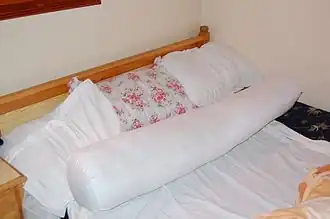 | Almohada cilíndrica | Es una almohada larga y estrecha, generalmente cilíndrica rellena de plumas. Utilizada para decoración o soporte lumbar cuándo se coloca en la cabecera. | |